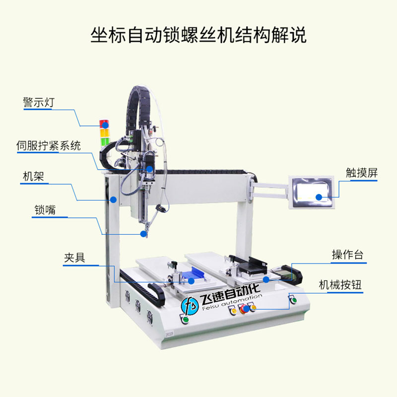 飛速自動化根據驅動器產品結構進行設計了一臺雙平臺坐標是自動擰螺絲機,驅動器需兩部分鎖付,其采用柔性化設計,并適合對同一產品不同型號的加工工件進行自動打螺絲,設備由PLC控制鎖付工路徑,各個工位實現單獨加工,配置觸屏器,控制器界面實時顯示擰緊過程的主要數據:扭力實際值、過程時間、是否合格等;由觸摸屏幕顯示、設置,設備還可以實時檢測轉速、控制軟啟動、控制轉角,篩選滑牙、假鎖等錯誤功能。 雙平臺坐標式螺絲機取螺上螺系統可同時進行取螺、上螺,并自動完成鎖緊動作,自動化程度高,定位效果精度高,使用簡單、方便、快捷,大幅度提高生產效率。