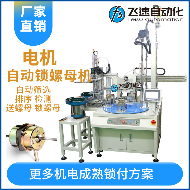 - 產(chǎn)品簡介: 風(fēng)扇電機(jī)自動(dòng)鎖螺母機(jī)自動(dòng)送螺母、擰螺母、取產(chǎn)品均由設(shè)備自動(dòng)完成。 電機(jī)風(fēng)扇是一種具有風(fēng)扇轂和葉片的電機(jī),其作用是產(chǎn)生驅(qū)動(dòng)轉(zhuǎn)矩的動(dòng)力源,風(fēng)扇電機(jī)主要由外殼、設(shè)于外殼內(nèi)的轉(zhuǎn)子、固設(shè)于外殼內(nèi)壁上且繞轉(zhuǎn)子設(shè)置的定子及端蓋組成。在組裝生產(chǎn)種需要用的五金標(biāo)準(zhǔn)件之一的螺絲進(jìn)行安裝緊固,廠家生產(chǎn)一直都是傳統(tǒng)人工進(jìn)行手工產(chǎn)品進(jìn)行裝配一枚一枚螺絲擰緊或者采用一種電動(dòng)螺絲刀來操作,在生產(chǎn)上不僅勞動(dòng)強(qiáng)度大,生產(chǎn)效率低,而且在擰緊工件時(shí)無法控制力度,出現(xiàn)旋緊力不均或者容易滑牙等問題造成不良產(chǎn)品。 為此廠家會(huì)選購一臺(tái)自動(dòng)化螺絲機(jī)來代替繁瑣的工作和提高工作效率 質(zhì)量等,飛速自動(dòng)化生產(chǎn)的轉(zhuǎn)臺(tái)式多軸自動(dòng)鎖螺絲機(jī),設(shè)備配置了一個(gè)轉(zhuǎn)臺(tái)多個(gè)工位操作,設(shè)備上配置了兩臺(tái)振動(dòng)盤自動(dòng)定向排序的送料設(shè)備,其工作目的是通過振動(dòng)將螺絲自動(dòng)有序定向排列整齊、準(zhǔn)確地輸送到轉(zhuǎn)臺(tái)操作工位上然后由四軸把螺絲放置在配置好的工件上進(jìn)行轉(zhuǎn)動(dòng)扭緊螺絲釘,將擰好螺絲的產(chǎn)品由機(jī)械手自動(dòng)送入出料倉,人工無需再去取產(chǎn)品,個(gè)過程都通過轉(zhuǎn)盤同時(shí)進(jìn)行,各工位互不干擾,設(shè)備優(yōu)勢在于減少人工作業(yè)量,工人放置產(chǎn)品即可,送螺母、擰螺母、取產(chǎn)品均由設(shè)備自動(dòng)完成。