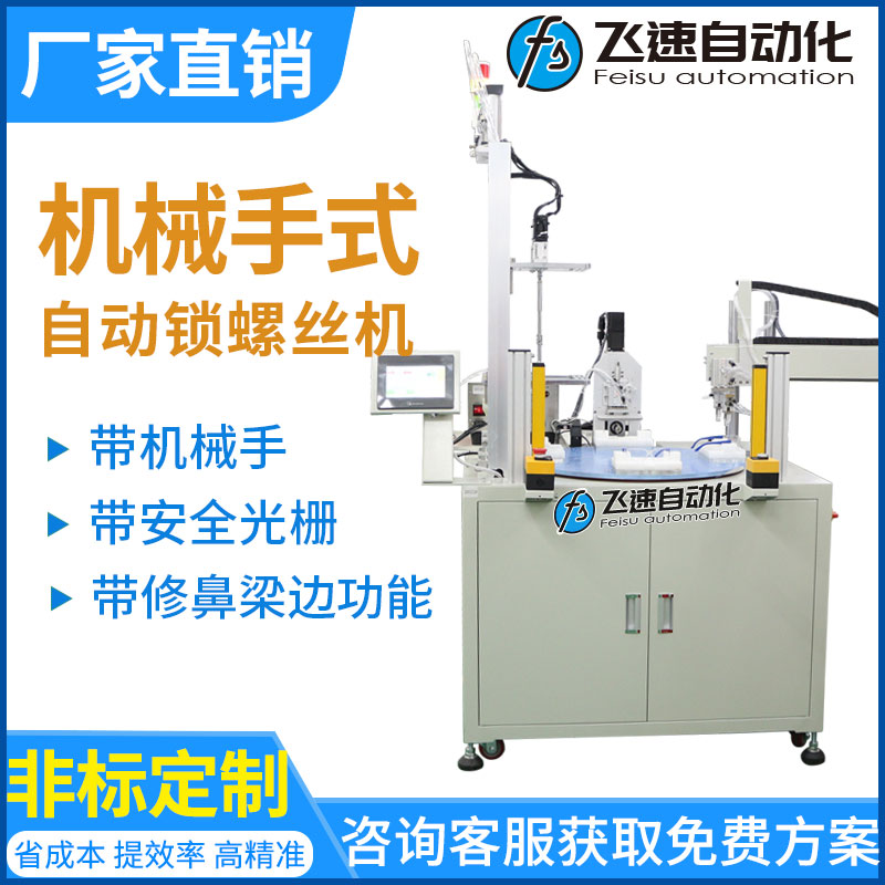轉(zhuǎn)盤機械手式擰螺絲機優(yōu)點: 省人工,流水線專用,配置機械手和轉(zhuǎn)盤,實現(xiàn)供料、檢測、鎖付、取放產(chǎn)品同步作業(yè),并由設(shè)備自動完成,節(jié)省大量人工;
